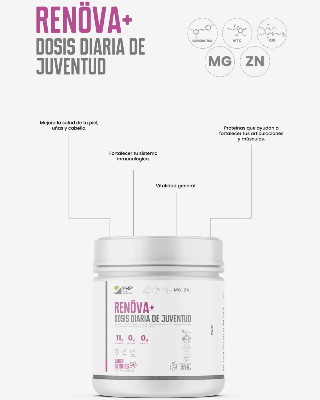 En nuestra tienda encontrarás Renöva+, un suplemento premium formulado con Resveratrol, Colágeno, Vitaminas y Antioxidantes que ayudan a: